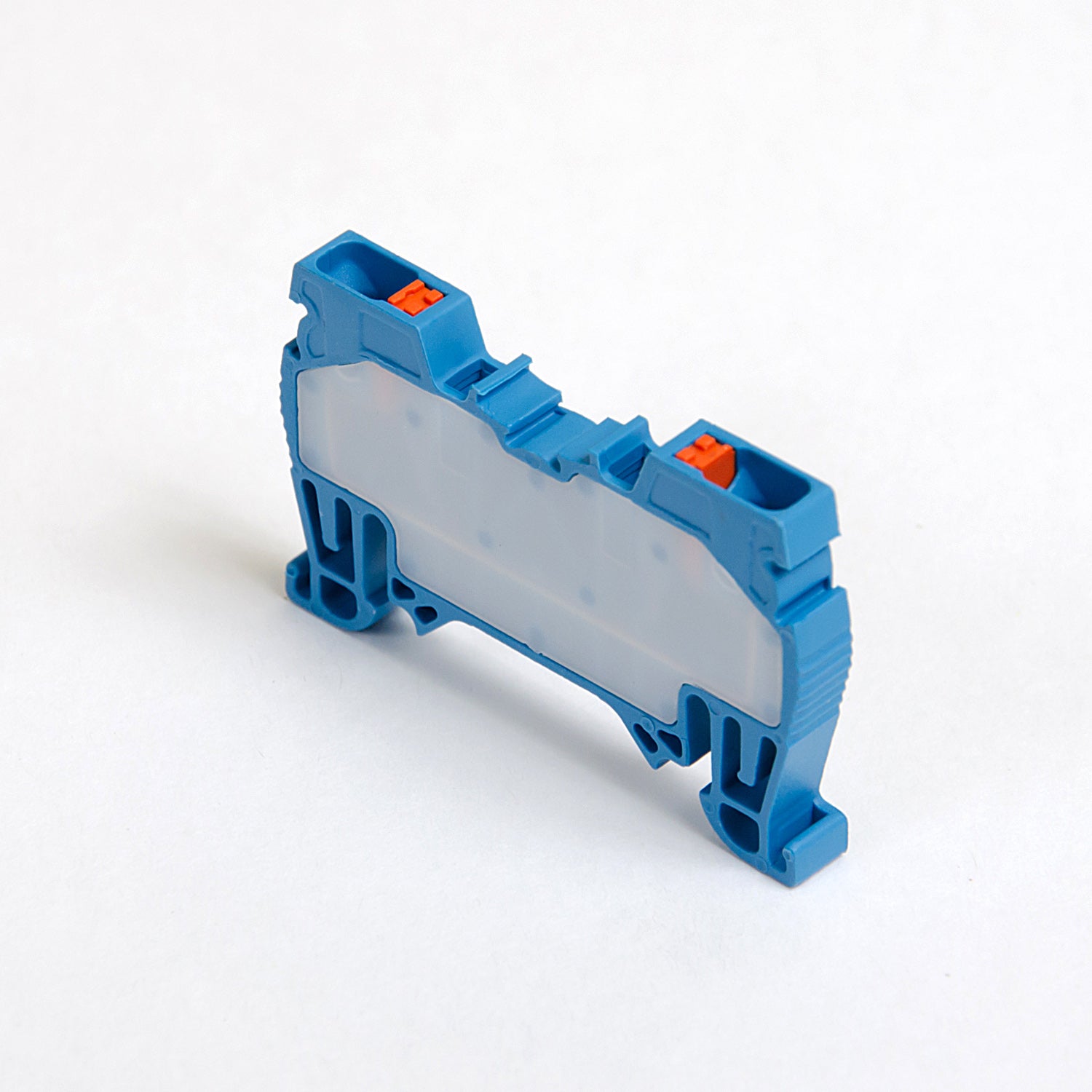 Spring busbar rail connector / DIN rail terminal 2-wire, retractable contact, blue, ONKA, made in Turkey.