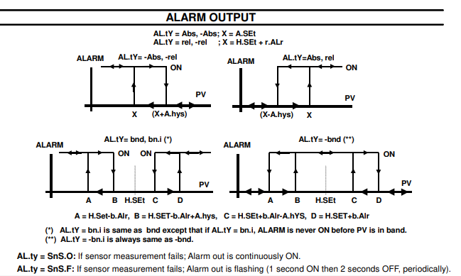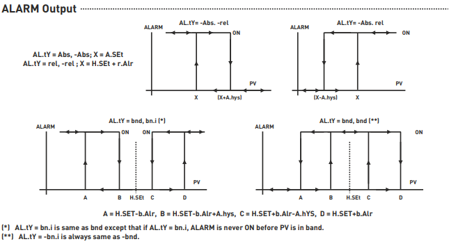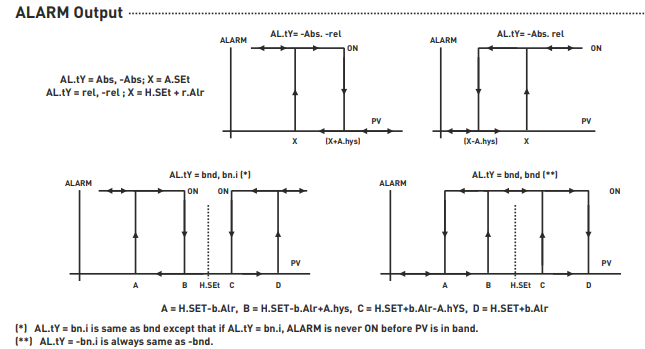 Relay OUT and ALARM (NO+NC) outputs 250 VAC, 2A (ALARM ON only on DT-48Y)