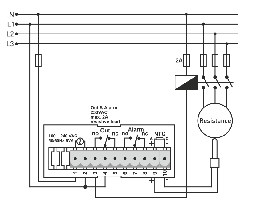 Relay outputs OUT and ALARM (NO+NC) 250VAC, 2A